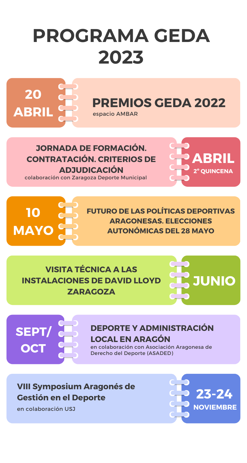 Zaragoza, se convertirá en la sede de la 1ª edición de los Premios GEDA el próximo día 20 de abril de 2023 en el marco de la celebración del 20º aniversario de la Asociación Aragonesa de Gestores del Deporte (GEDA).